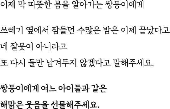 쓰레기 옆에서 잠들던 수많은 밤은 이제 끝났다고 네 잘못이 아니라고 또 다시 둘만 남겨두지 않겠다고 말해주세요.