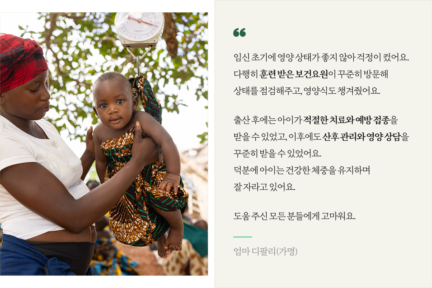 출산 후에는 아이가 적절한 치료와 예방 접종을 받을 수 있었고, 이후에도 산후 관리와 영양 상담을 꾸준히 받을 수 있었어요.